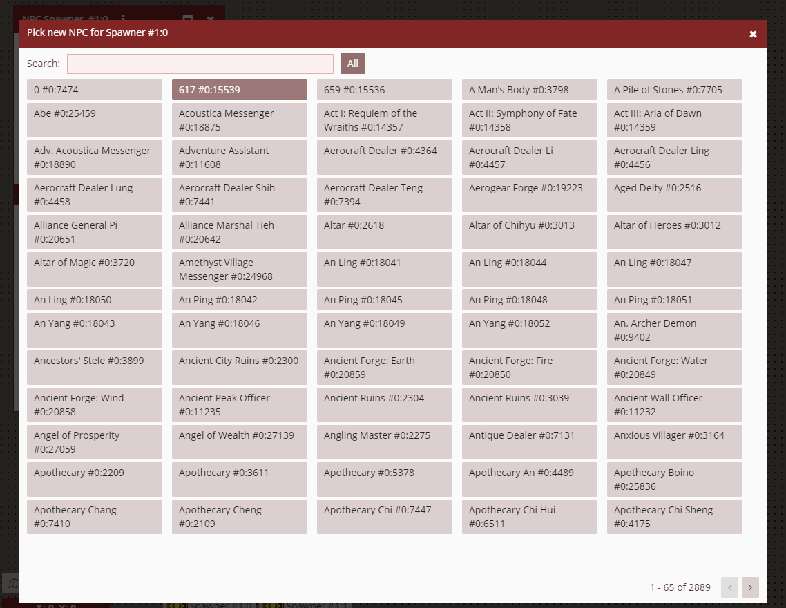 If you decide to pick a different NPC type for a spawner and select Pick, you will be given a fullscreen window with all objects of that type listed.