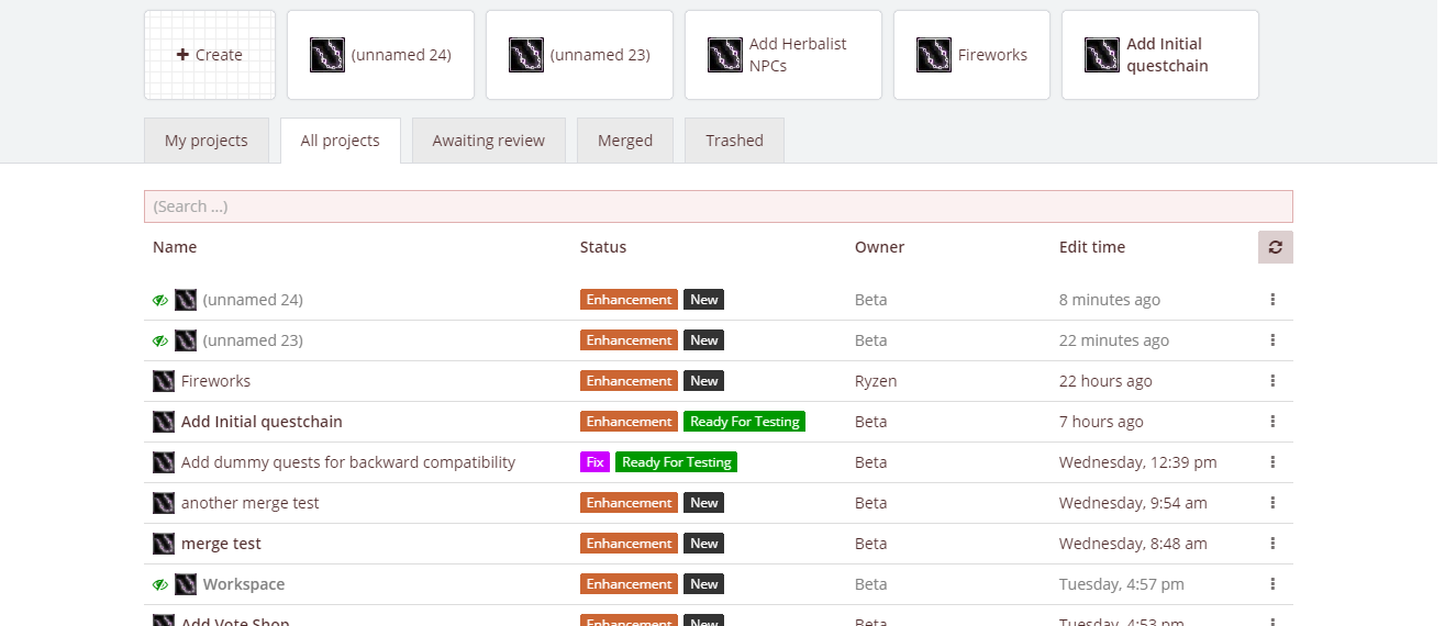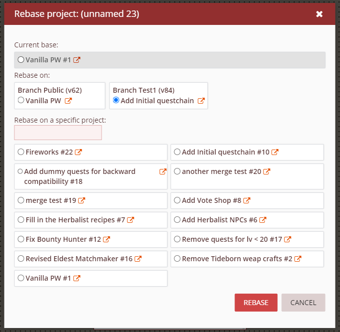 If there is some project merged while you're still working on some other project of yours, the merged changes won't appear in your editor. There won't be any third-party changes at all. Your project always stays at the same state you left it, no surprises. To make those additional changes appear in the editor, you have to rebase your project. You can rebase on the latest version of a branch, or any other project even if it's not merged yet. If you see a project from someone else with a new NPC, you may choose to suggest changes to it by creating a new project directly on it and applying those changes yourself. If approved, the base project as well as your new project can be merged one after another.