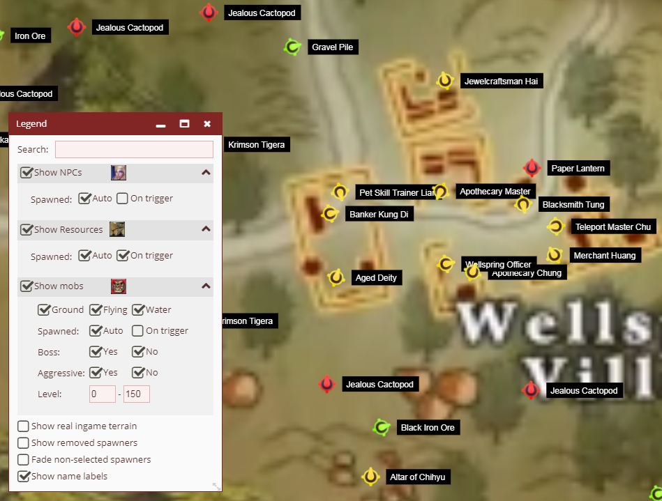All of the above are called spawners. They represent some type of NPC/Mob/Resource placed in a specific spot. It's important to understand that a spawner and its spawned object type are two separate entities. There can be multiple spawners for the same NPC type, in which case modifying that NPC type (e.g. its name) will affect all spawners for it. The same applies to sold Goods, offered Crafts, items, etc. Let's take an example: There's just one definition of Venomous Ghoul monster (the monster west of Archosaur) and about 10 spawners for it. If you modify the Venomous Ghoul properties, all 10 spawners will be affected. When opening some edit window for an object you can easily identify which properties are separate objects just by looking at the button style.